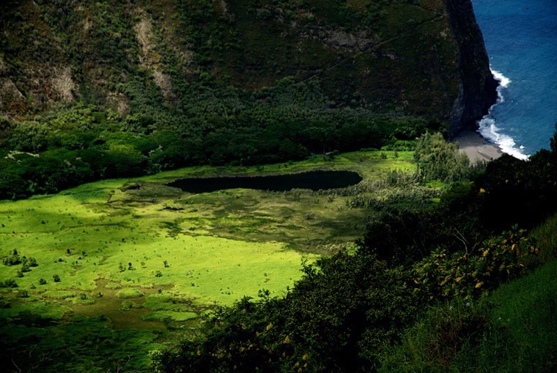 This image portrays the verdant green floor of the Waipio Valley on the Big Island.